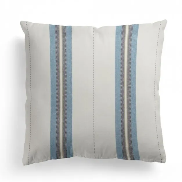Cette housse de coussin à rayures repense la décoration au style basque en empreintant les codes du prêt-à-porter ; ses rayures semblent celles d’une jolie chemise estivale avec un tissage sophistiqué. Nous adorons la petite ligne en pointillés qui se trouve entre les deux pas de rayures.