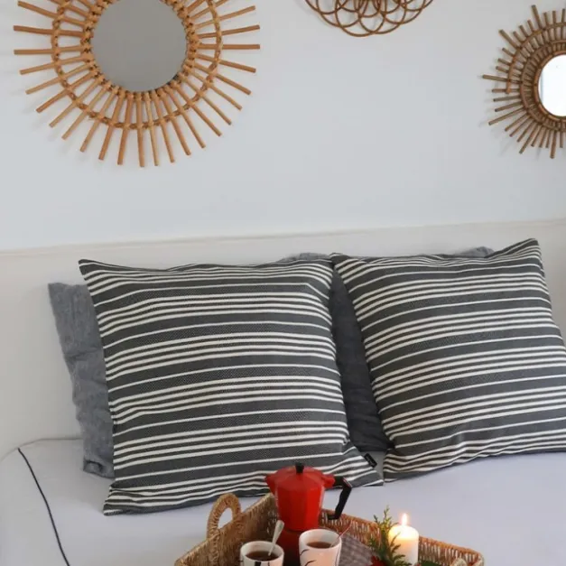 Découvrez le coussin haut de gamme Souraide tissé en une teinte noire et écru. Ce coussin en tissage Jacquard combine tradition et modernité en dévoilant de superbes rayures inspirées du linge basque. Intemporelle, il habille votre chambre avec élégance en se mariant à tous les styles de décoration.