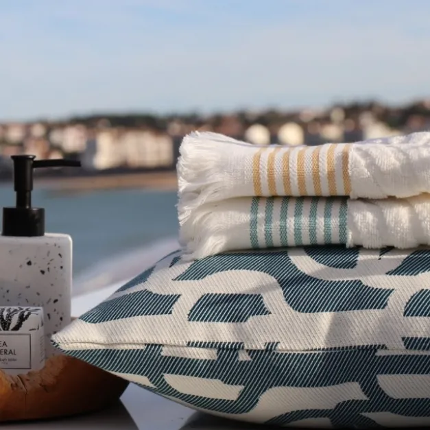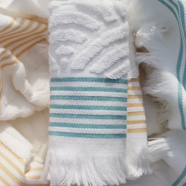Découvrez les serviettes d’éponge Artea avec leurs bordures en rayures tissées couleur bleu lagon, très été et frais pour décorer votre salle de bain. Elles seront aussi très pratiques pour vos invités durant leur séjour dans votre jolie maison.