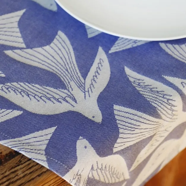 Le tissage Jacquard confère du caractère au tissu. Il le rend résistant et le motif se retrouve sur l’envers et l’endroit. La couleur bleu intense des fils de coton met en valeur les oiseaux de couleurs écru. Cette tainte rappelle le ciel puissant de la côte Atlantique.